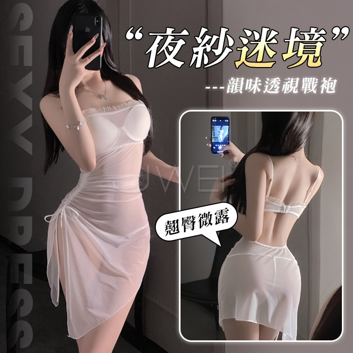 月暮迷紗.性感裸紗蕩領透視側開衩細肩帶美背睡裙【睡裙+T褲-白色】