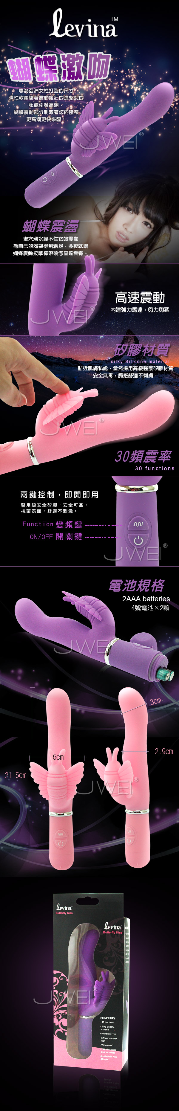 棒身使用安全矽膠製成,無臭且觸感光滑柔細,專為亞洲女性開發設的尺寸,大小適中,不會過大造成不適,符合人體工學設計,給女性最舒適的進入角度,電源鍵打開電源後,另一鍵控制30種不同震動頻率,操作超easy簡單,再加上防潑水設計不論是在使用時或清洗時都更為方便快速。