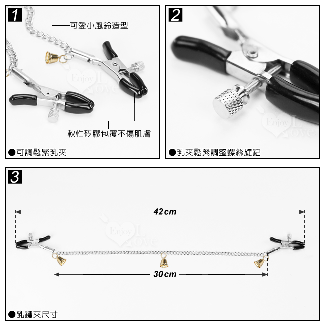 帶鏈風鈴乳夾,兩個乳夾中間有鐵鍊連接,總長41公分(含夾子),鐵鍊粗寬0.5公分,它有一定的重量(建議可於鐵鍊中加掛飾品),在調教時隨著身體的變化,可以給乳頭帶來很強的刺激。