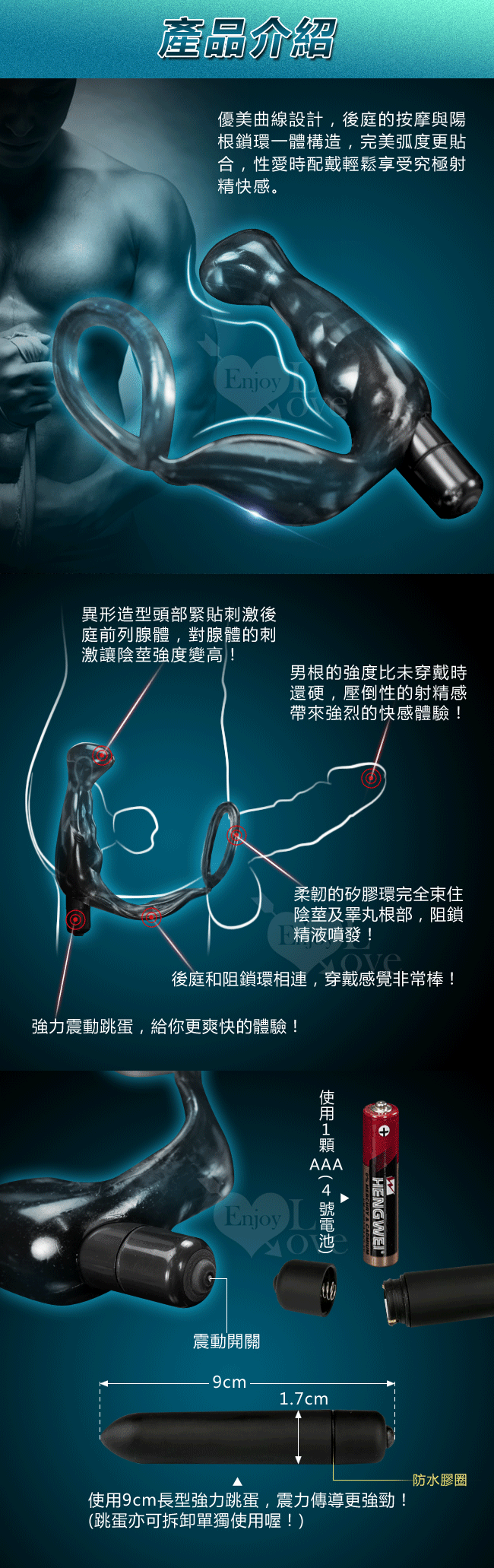 鎖精環、前列腺剌激器、雙功能於一身,本商品獨特之處在於多功能的玩法,可將鎖精環端套在老二根部,然後將前列腺按摩棒轉向後面插入肛門,進行抽插運動的同時,前列腺的按摩棒也帶來來強烈的震動酥麻快感,尤其是在射精的同時前列腺收縮帶來的強烈快感,那種莫名的強烈快感是無法用言語形容的,只有親身體會過才能明白那種超強烈的快感。 除此之外,內建的震動器可以取出單獨當做跳蛋使用,可以用來按摩身體的敏感部位,其超強的震動力,保證可以迅速讓妳達到高潮,防水的功能也讓日常使用更方便。 ※ 電源:4號電池1顆(需另購) ※ 此產品詳細說明及樣式如圖所拍攝,敬請參閱選購。