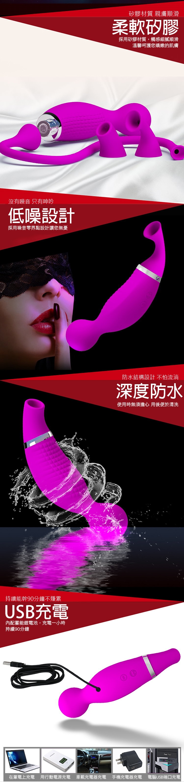 商品規格 : 用途:女性自慰之用 材質:矽膠 規格:電壓1.5V震動 / 1組(震動器 3種可替換吸盤) 電源:USB充電式 淨重:200g 總重:480g 尺寸:如圖所示 外盒尺寸:30x11.8x5.1cm 備註:內附USB充電線x1、防塵袋x1 注意:請與潤滑液共用,並保存於陰涼處,欲重覆使用,用後清水沖洗。 ※情趣用品屬於個人衛生用品,經拆封使用,無法接受退換貨!※ ※每台電腦的解析度皆不同,可能有些微色差,顏色皆以實品為主!※