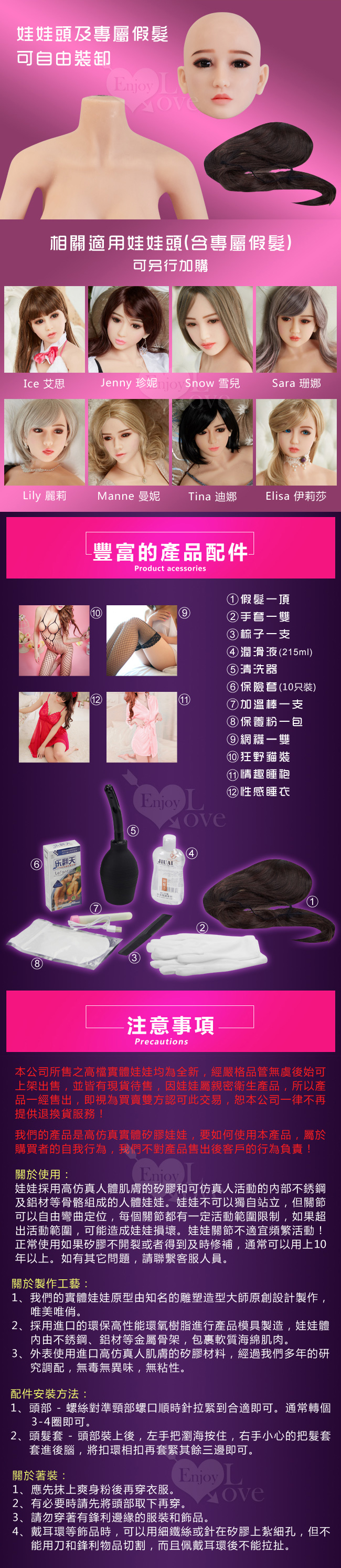 【材料】外皮(皮膚)為高級無毒超軟TPE,內有金屬骨架,四肢的活動範圍與真人類似。