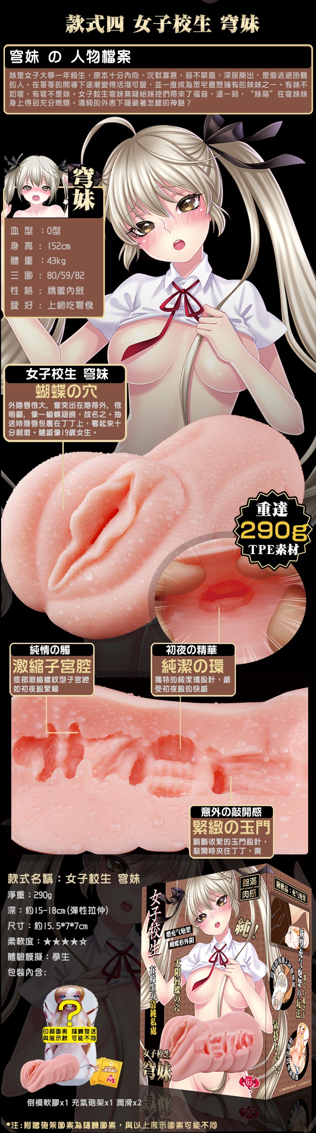 用途:男性自慰之用 材質:PVC+TPE 規格:充氣式/非貫通/女白領 淨重:自慰器約305g、充氣枕約100g 總重:約490g 尺寸:全長約14.5cm 寬約8cm 可深入長約14cm 外盒尺寸:18.1x13.7x8cm 內容物:充氣枕x1、自慰器x1、6ml潤滑液x2、福利卡x1 注意:請與潤滑液共用.並保存於陰涼處,欲重覆使用.用後清水沖洗。 ※情趣用品屬於個人衛生用品,經拆封使用,無法接受退換貨!※ ※每台電腦的解析度皆不同,可能有些微色差,顏色皆以實品為主!※