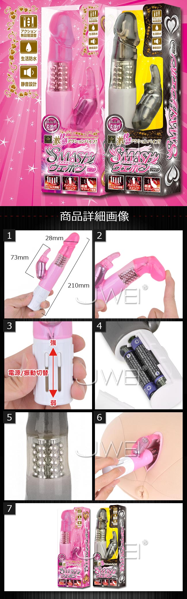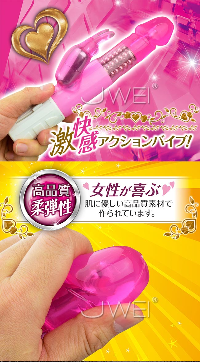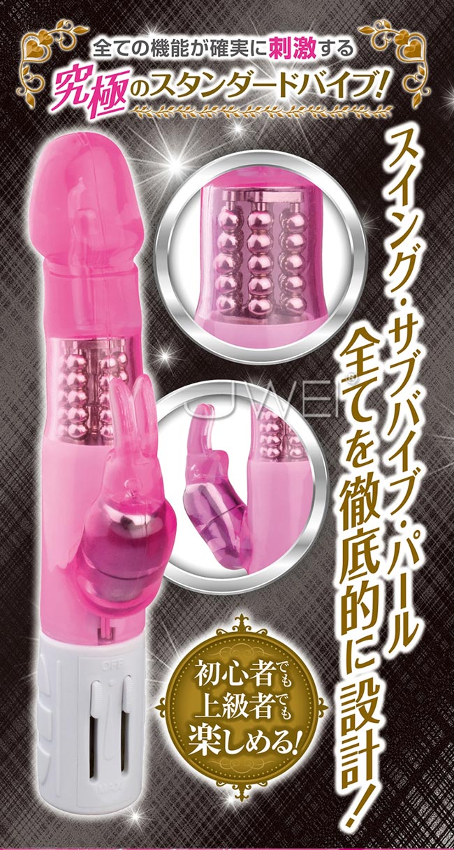 激快感を味わえるアクション満載のスタンダードバイブレーター。 ハイパワーアクションを超簡単に微調整できる、無段階のスライドタイプスイッチを採用しているので、初めてバイブレーターを触るという方でも直感的に操作が可能になります。 ツルツルとした表面ボディは、モチモチとした触り心地の良質素材なので、入れ心地抜群。そして、亀頭デザインの先端部分が中でグルグルと膣壁を刺激し、大胆に回転する内蔵パールが入口付近をウネウネと責立てます。さらに、痺れるように刺激する子機バイブ振動の2点同時責めに、悶絶する女性が続出。 スタンダードな形のバイブだから、初めてバイブを使う方も、バイブ好きな方も満足して頂ける1本です。 また、メンテナンスが楽な生活防水仕様と、周りを気にせず使える静音設計なので安心してお使い頂けます。