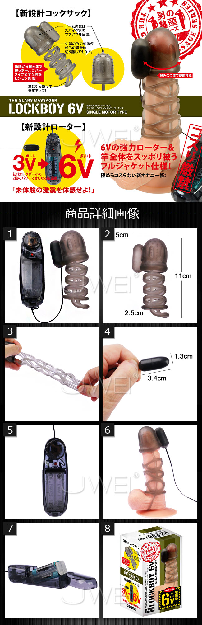 全体を覆う網目状のカバーは、先端ドーム内にツブツブを配置し刺激をアップ。また、サオ部にある網目状のサックが不要だと感じる方は、切り離して使用する事も出来ちゃいます。または、このまま使う時には、網目の底部がリング状になっているので、玉に引っ掛けて感度をアップすることも可能です。 3Vから6Vにパワーアップした振動だから、未体験の激震動を体感して頂けます。