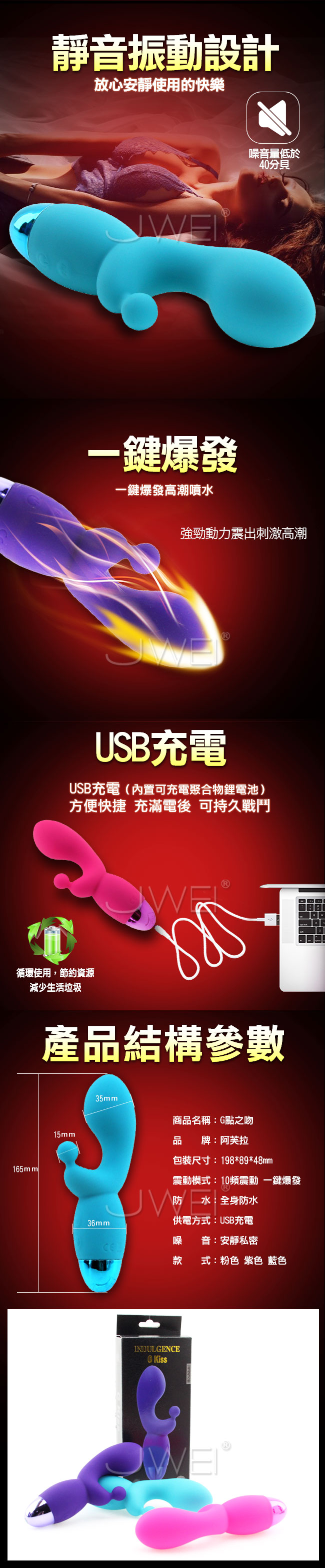 G KISS給您最親密的高潮體驗!多種震動挑逗您全身敏感神經,讓您無法內心最深的欲望!可刺激陰蒂達到一波一波的高潮,按壓G點瞬間愛液阻止噴湧爆發潮吹快感。完美親膚的造型設計讓您輕鬆刺激陰道內部的每一個角落給您最真實的感受,引爆內心深處欲望。一棒在手,高潮無憂10段變頻強力震動帶給您陣陣舒爽,讓它做您最親密的愛人。每一處細節都是想讓您爽!另外擁有一鍵爆發瞬間超頻,激發身體中最深處的高潮。採用節能環保USB充電讓您愛愛不停歇持久戰鬥。整體防水讓您洗澡時也能盡情享受激情喔~