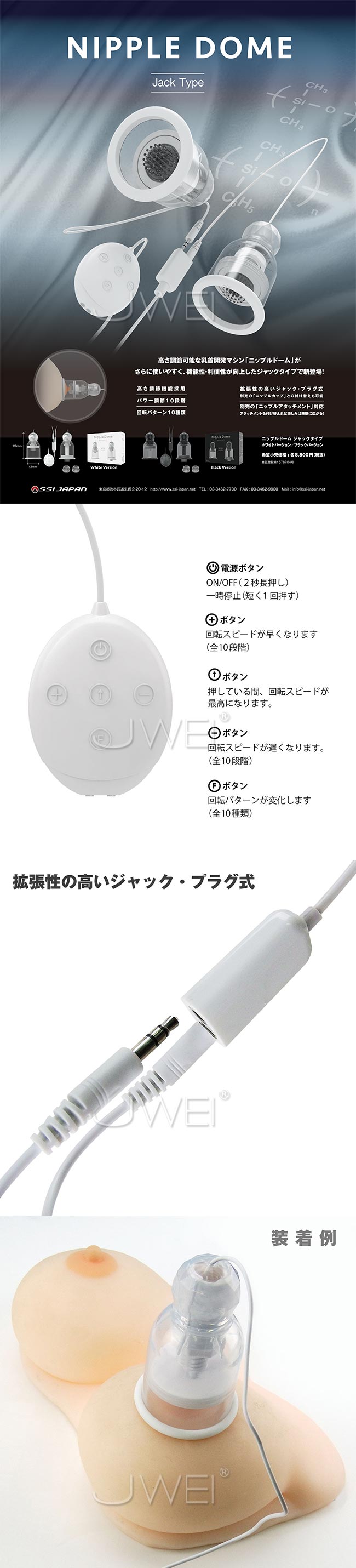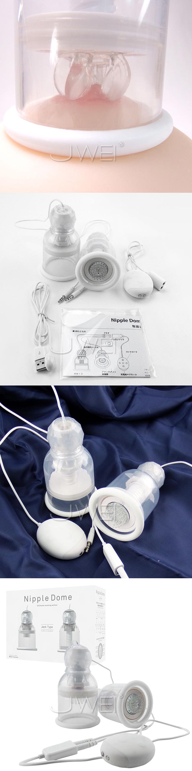 乳首開発マシーン「ニップルドーム」が更に使いやすく、機能性・利便性が向上したジャック・プラグタイプで新登場しましました。 乳首責めグッズとしては高性能なグッズで、テレビをはじめとした多くのメディアで取り上げられ発売開始すぐから、爆発的な人気アイテム。 本体のハンドルタイプの吸引と、アタッチメントとの設置高さ調整機能があるので、ほとんどの方にフィットするアイテム。装着のコツとしては、初めにおおよその高さ調節をしてから、吸引すると上手にフィットします。 10段階のパワー調節と、10種類の回転パターンを搭載している高性能。さらに、いつでも最強最速回転を繰り出せる「ターボモード」が備わっているから、自分のタイミングで最強パワーを楽しめます。 別売りのニップルアタッチメントに対応しています。 カップと肌が触れる部分にシリコン素材が使われているので、シリコンローションの使用は避けて、水溶性のローションをご使用ください。