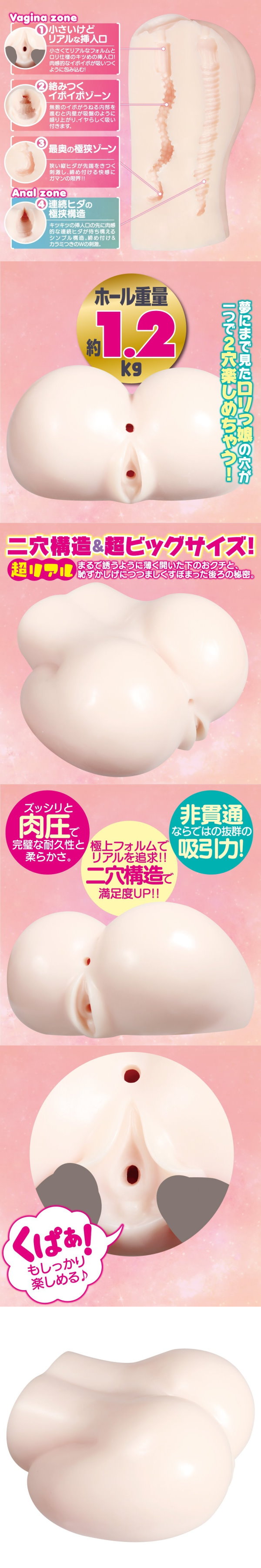 男の浪漫復活! 大人気を博した貴方の「ぷにあな」が熱い要望にお応えし帰ってまいりました! 狭いのにぷにぷにで無造作ツブツブ・うねり形状がとっても刺激的な可愛いアソコと、包み込む刺激が味わえる無限リング型ヒダヒダのア○ルがあなたのお○ん○んをお出迎え! プリンとした肌質も、くぱぁもそのまま完全再現♪ 2穴で楽しみ方倍増なのに、重さも1.2kgで重量感たっぷりだから超お買い得!