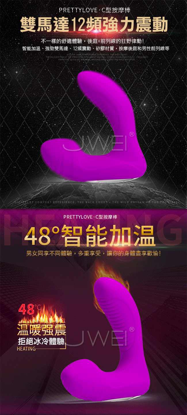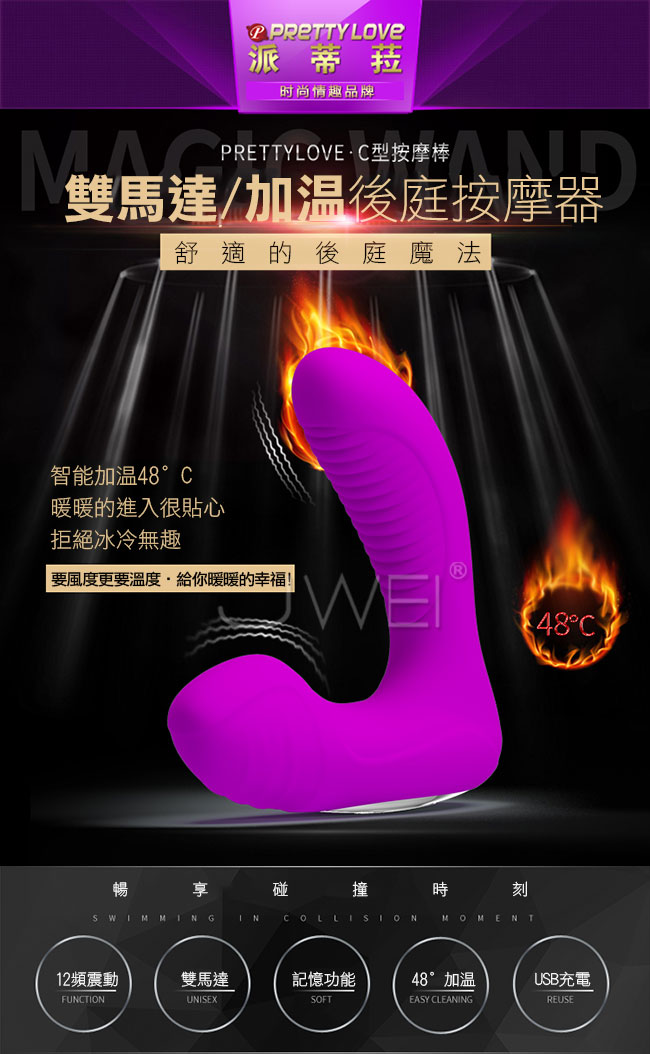 ►您現在的位置:首頁>Pretty Love.Lillian 12段變頻雙馬達智能加溫C型後庭按摩器