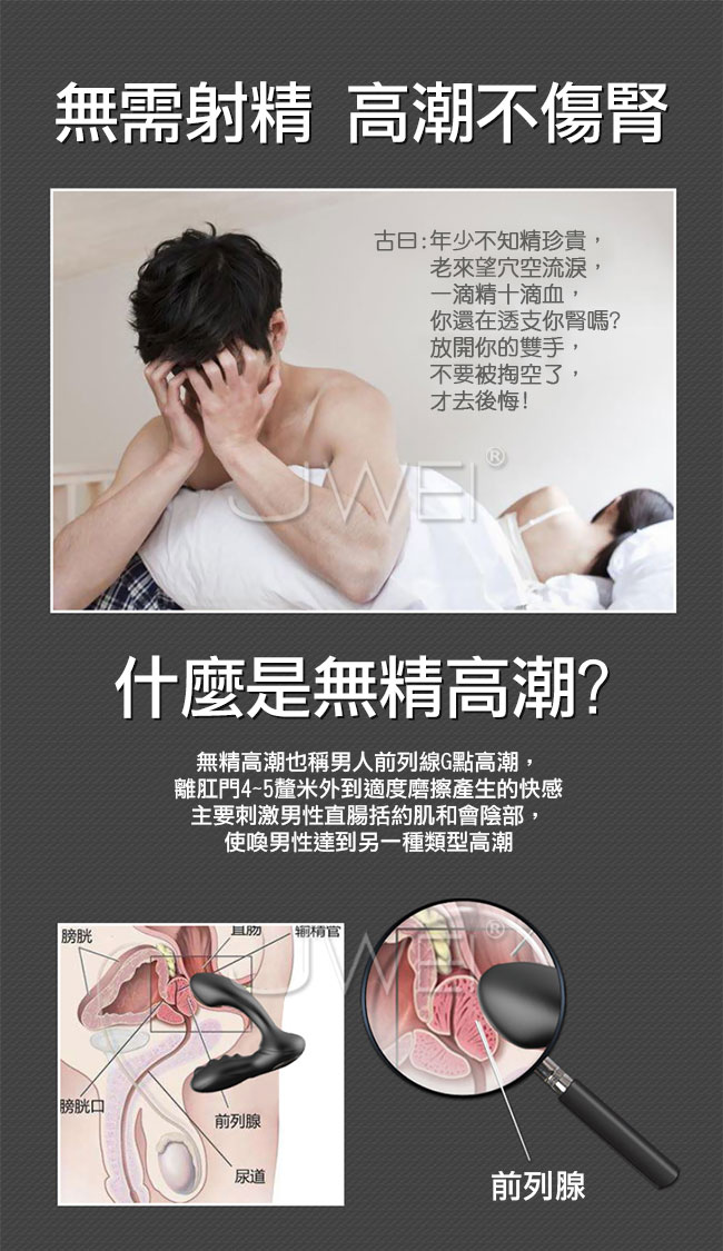 男人們!戒擼吧!體驗過無精高潮嗎?角鬥士帶您通過前列腺G點高潮喚身為男性的無精高潮!讓您擺脫困境善待自己清鬆展縣男兒本色。此款為雙頭震動同時朝您的會陰穴和肛門G點摩擦,讓您在按摩時同時享受後庭高潮!為全包膠設計讓您能盡享魚水之歡!採用USB充電一次充滿即可激戰1小時徹底滿足你~
