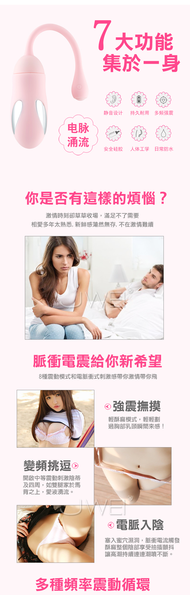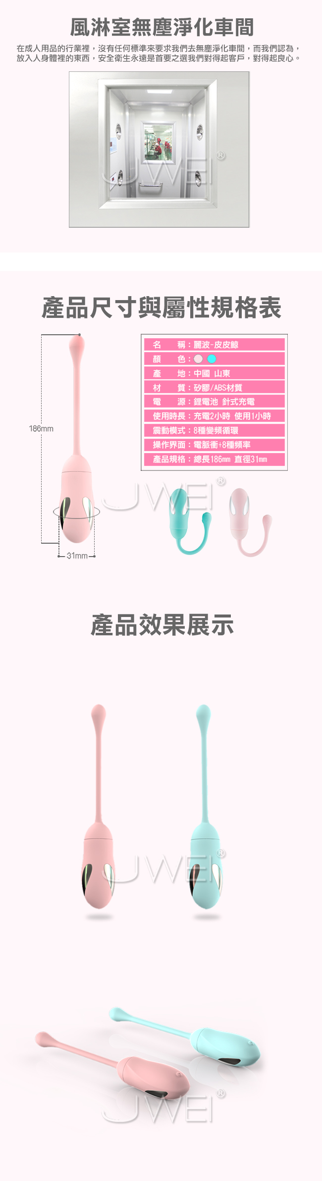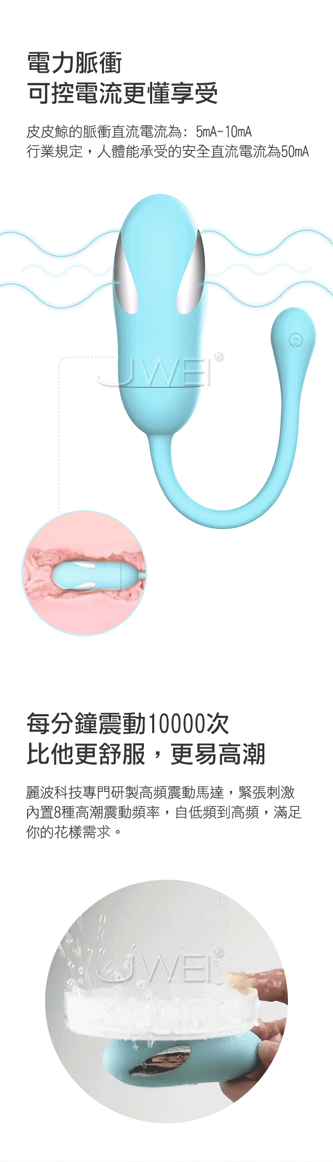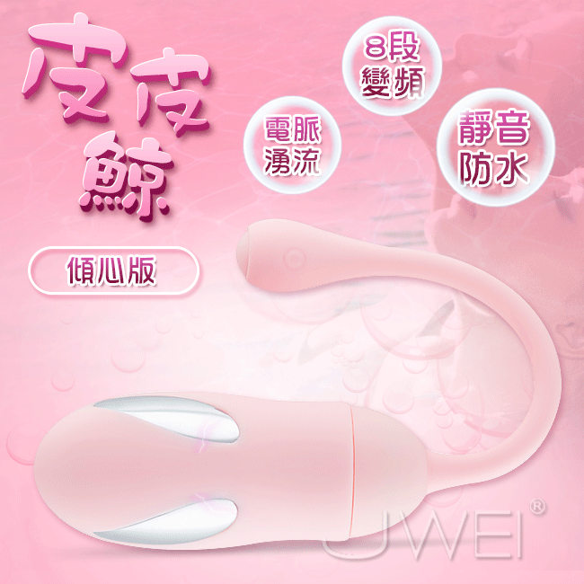 可愛的皮皮鯨電波脈衝無線跳蛋,可愛的外表擄獲許多女人們的心!皮皮鯨的脈衝電流給您觸電般的快感讓您一觸即嗨酥麻您全身上下所有神經!採用高頻震動馬達,搭配內置8種變頻從低頻到高頻,滿足您所有花樣給您想要的高潮享受。擁有超靜音聲學設計,讓您不在受到噪音的困擾喔!採用針孔式充電防水耐用,充電方便滿足您不只一次的需求。而跳蛋本體採用安全矽膠環保無毒,給您最細膩溫潤的高級體驗!