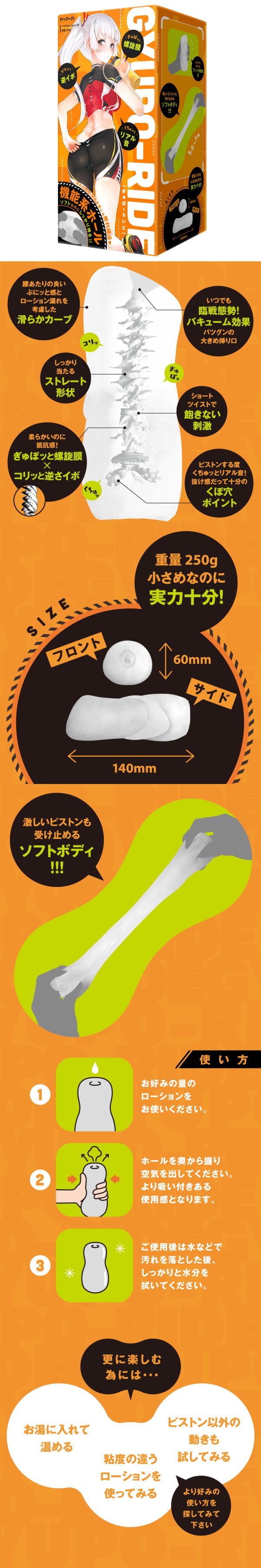 ぎゅぽッとしっかり搾り取る!PPPより内部構造"に特化した『機能系ホール』登場★『ただのネジレ形状でしょ?』と侮る事無かれ!優しい柔らかさに反し、螺旋膜×逆さイボのW構造と、ピストンする度ぎゅぽぎゅぽクチュクチュ…リアルな水音を完全再現のくぽ穴設計で本気の"優勝"は間違い無し!『ソフトなのに意外としっかりしてるじゃん…』事後にはそんな感想が漏れちゃう実力派のホールです★パッケージイラスト:_太子