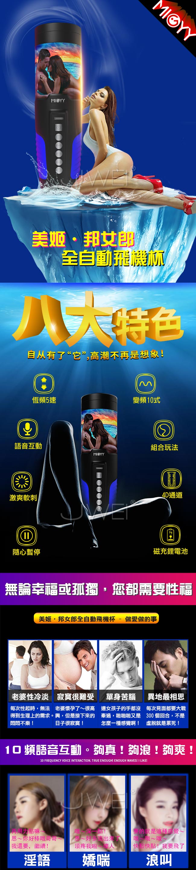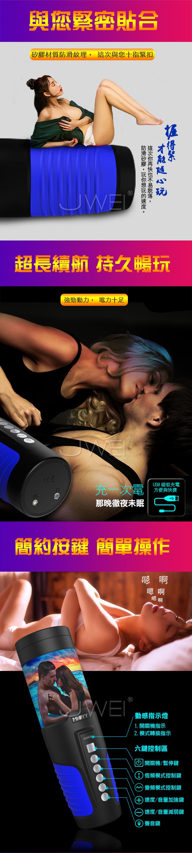 全自動抽插伸縮不用動,高潮不再只是想像!10頻5速伸縮全力抽插一吸一放,澎湃高潮狂襲而來。上下左右高速爆抽喚醒您沉睡的大鵰~採用模擬肌膚的材質4D逼真通道,柔軟超彈刺激您每一寸肌膚。10種互動發聲叫床,讓您選擇今晚要插哪一個!握把設計防滑矽膠再快也不擔心脫落,玩您想玩的速度。採用USB磁吸充電,一次充電讓您徹夜未眠方便快捷。