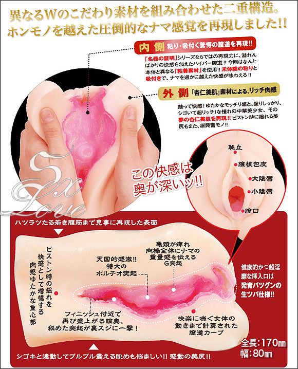 名器の証明5作目となる本品は、アジアンビューティーの世界観に、新技術を取り入れたシリーズ最高傑作である。中国ネット検索No.1のモデル「張篠雨」氏の協力で実現された完全移植ホールは、これまで写真でしか触れられなかった彼女のありのままを体感できてしまうこととなり、彼女を知る人民にとってはそれはそれは驚愕の内容であろう。ホール製作を任されたNPG技術陣は、世界で最も販売数を誇る”名器シリーズ”の職人たちであり、彼らが温めていた粘膜素材&二重成形により、これまで以上のリアル感を出すことができたと胸を張って話していた。内部は薄赤い着色と隆起したヒダがいやらしく並び、お馴染みの無次元加工で表現された数々の仕掛けは、柔らかく豊富な肉厚と合い重なり、絶妙のアプローチでペニスを包み込む。使う人の好みもあるが、弊社モニター3人ともに、「初代品格を超えうる快感ではないか?」と報告もあり、期待できずにはいられない超大型商品になりそうだ