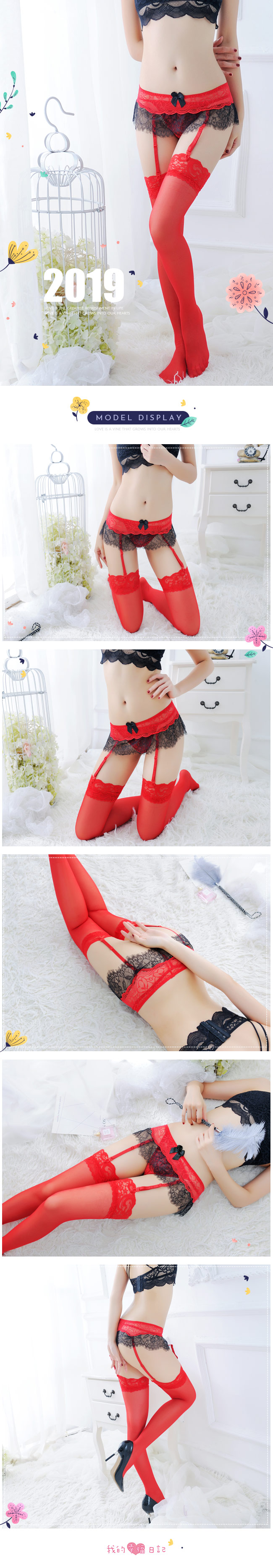 | 楚楚可人.睫毛蕾絲撞色吊襪帶三件組(紅)