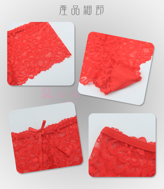 無限驚奇,無限想像~ 嬌媚姿態,讓全世界都繞著妳轉動; 曼妙身軀,讓每個男性都喘不過氣! ※ 內褲款式:平角內褲。 ※ 設計特色:緹花蕾絲。 ※ 商品材質:蕾絲。 ※ 功 能:性感、美體。 ※ 腰 型:低腰。 ※ 顏 色:紅色。 ※ 商品尺碼:FREE SIZE (適合腰圍23~29吋)。 ※ 注意事項:基於保障消費者個人衛生,此貼身衣物恕不接受退換貨,謝謝您! (如為商品本身暇疵,接受七日內換貨,請勿試穿,謝謝您)