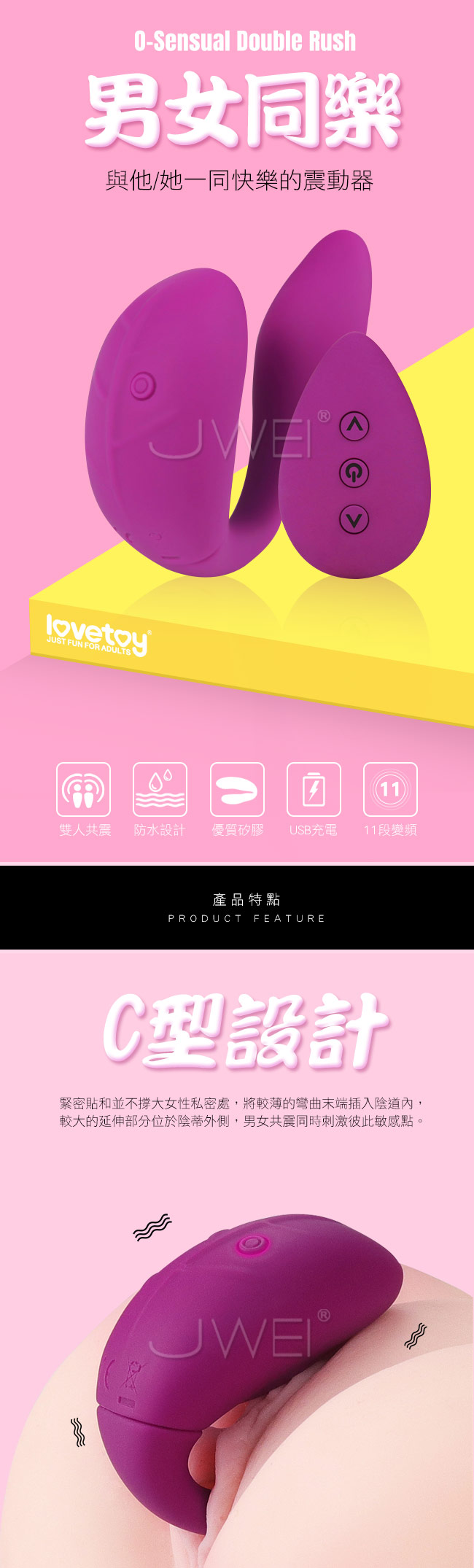 此款高品質精緻男女共震震動器,提供大膽時尚的色調。C型設計符合人體工學緊密貼和不撐大女性私密處可同時刺激男女雙方,非常適合與情一侶愛人同使用。擁有強力雙馬達設計擁有11種變頻震動模式,多種選擇挑選出最適合彼此的高潮模式。可遠端操控讓您不管是在電影院裡或走在路上隨時隨地開啟震動,與愛人體驗一場刺激的性愛模式而不怕被發現喔~100%防水功能不擔心愛液洶湧,搭配低噪設計讓您享受私人靜謐空間,不怕被聽見打擾與愛人的甜美時光~