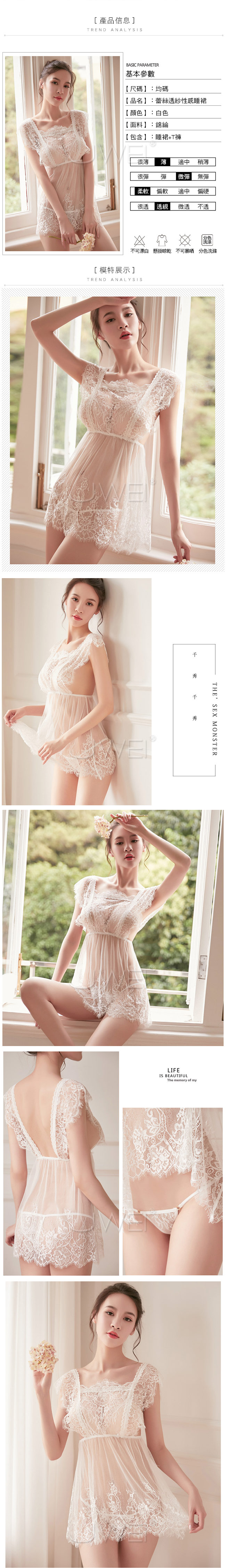 ◇◆朦朧之月.睫毛蕾絲裸感透紗性感睡衣(白色)◆◇