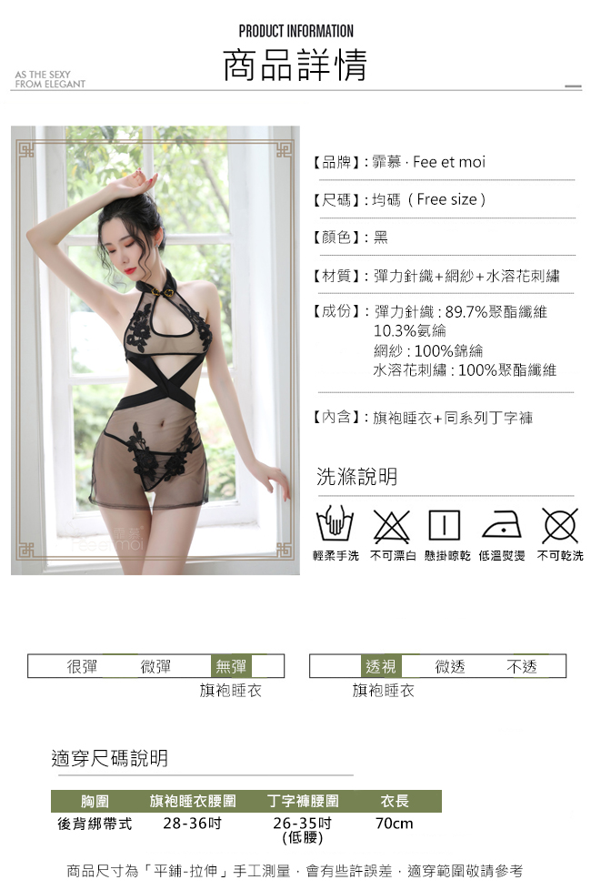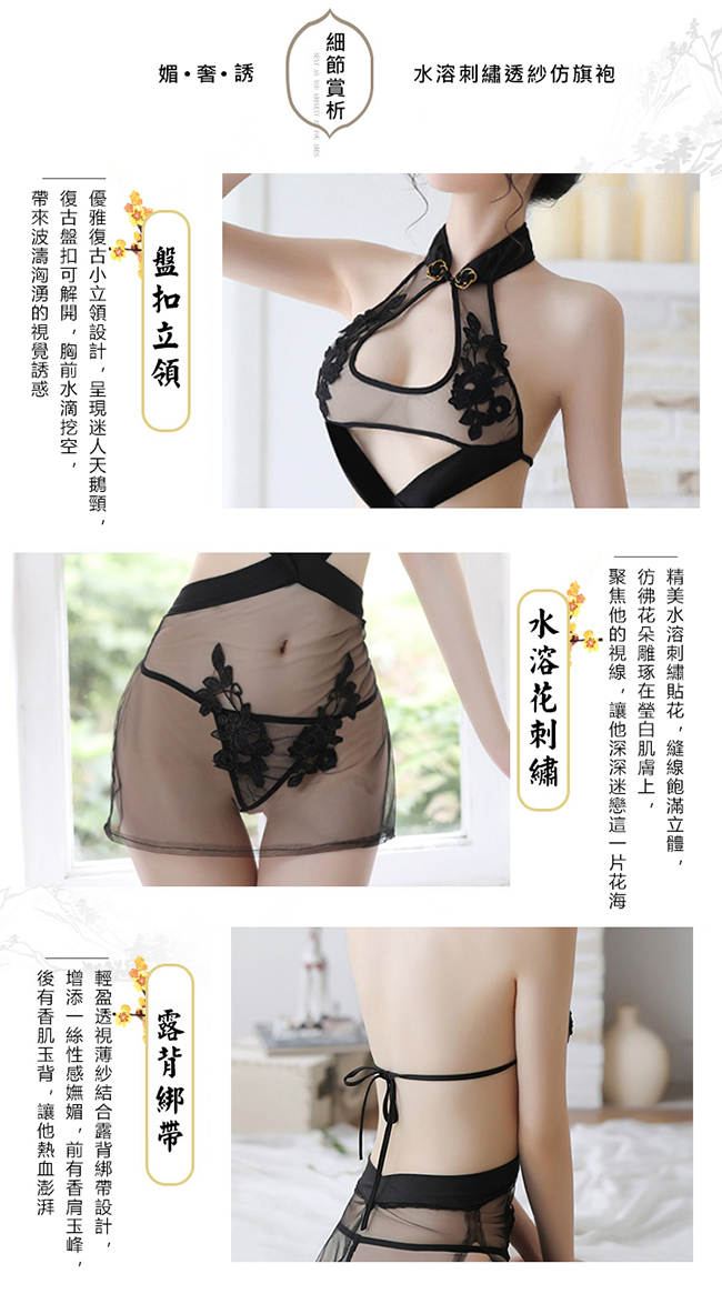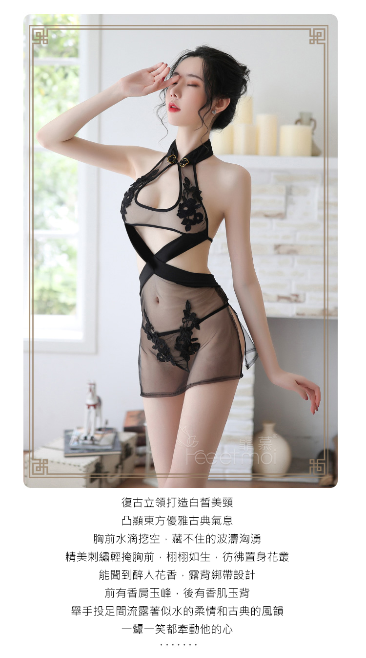 ►您現在的位置:首頁>仿旗袍睡衣!盤扣立領水滴挖空刺繡貼花裙側開衩兩件組﹝黑﹞
