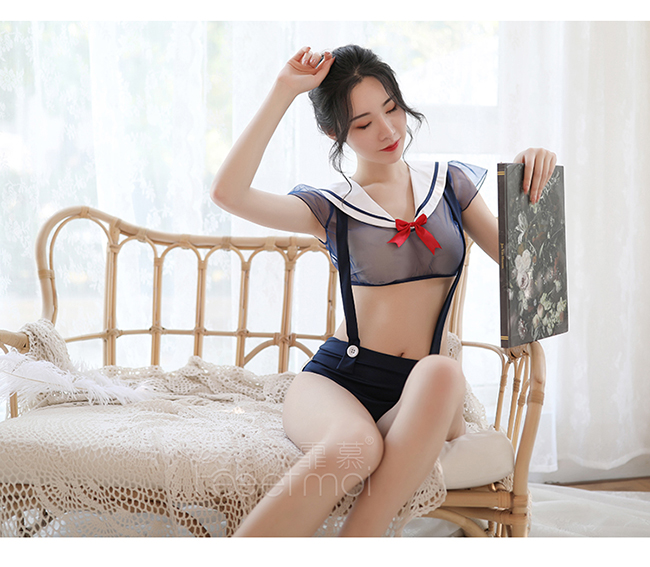 | 學生角色扮演服!網紗水手領後Y型吊帶開檔褲兩件組﹝藍上衣+藍褲﹞