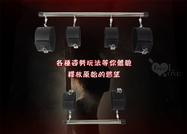長50公分連杆可手腳連銬固定一起,附有手銬兩隻及腳銬兩隻,銬環套大小可調,並各帶有小鎖。