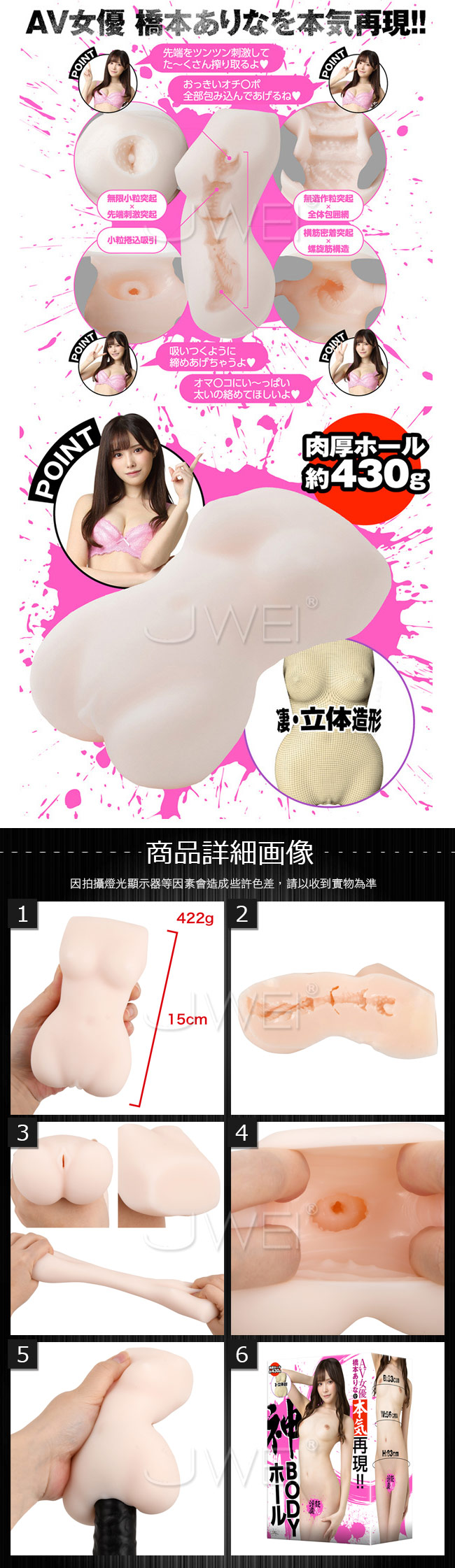 AV女優橋本ありなを本気で再現した超絶快感構造ホール。 カタチの整った柔らか美乳と、小ぶりで愛らしいおっぱいを再現したエロチックボディ。 挿入すれば、横筋密着突起と螺旋筋構造で奥へ奥へといざないます。そして、無次元小粒突起に、先端刺激突起など、休む暇のない刺激的な構造です。 吸い付くように締めあげちゃう内部構造と、艶美に魅了する至高の腰つきの極細ウエストに、思わず見惚れる魅惑のお尻でリアルな「橋本ありな」を妄想しやすくなっています。