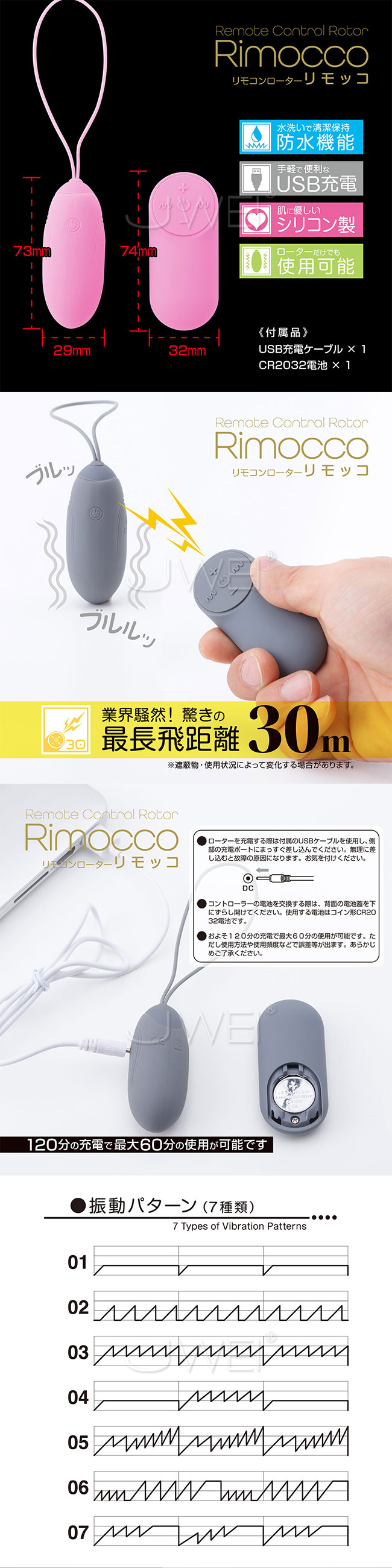 手軽に遊べるリモコンローターの中でもトップクラスの性能を誇る逸品です。なんといっても自慢はその飛距離、最長30mの距離でプレイをお楽しみいただけます(遮蔽物・使用状況によって誤差が生じます)。パワフルな振動と7パターンのアクションを自在に操り、バリエーション豊富なプレイをお楽しみください。また本製品はローター部分だけでも使用可能、遠隔プレイ以外の楽しみ方も可能です。肌に優しいシリコンを採用し、使用者に寄り添った使い心地を実現しました。防水機能を装備し、使用後は洗って清潔に保管できます。ローターの充電は手軽なUSB方式を採用し、誰でも簡単に充電を行うことが可能です。リモコンローターを初めて使う人からベテランユーザーまで、多くの方々にオススメできる逸品です。