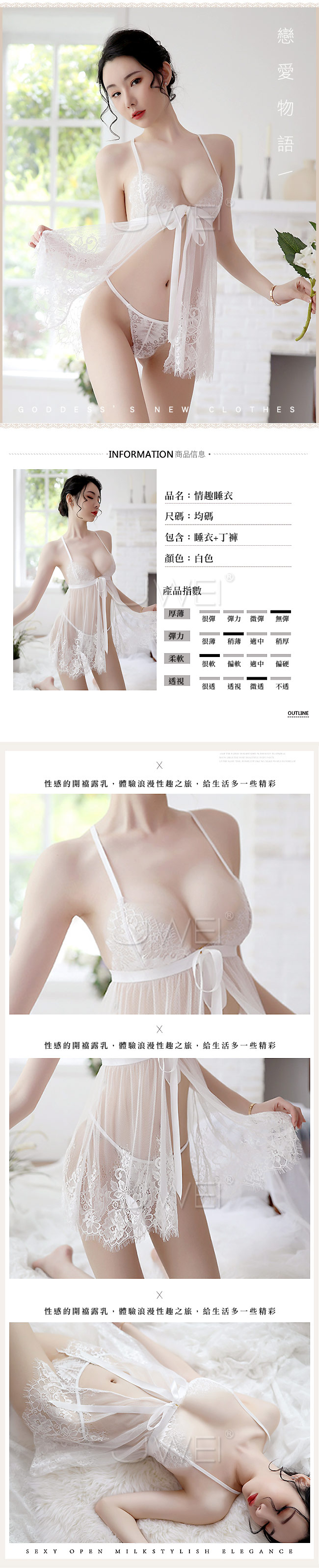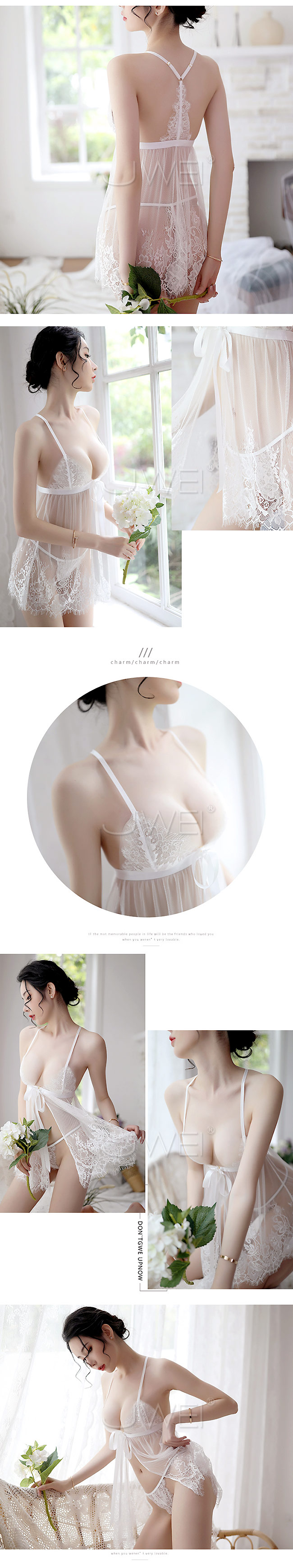 ◇◆情遇甜心.深V唯美前衩睫毛蕾絲透視睡衣(白色)◆◇