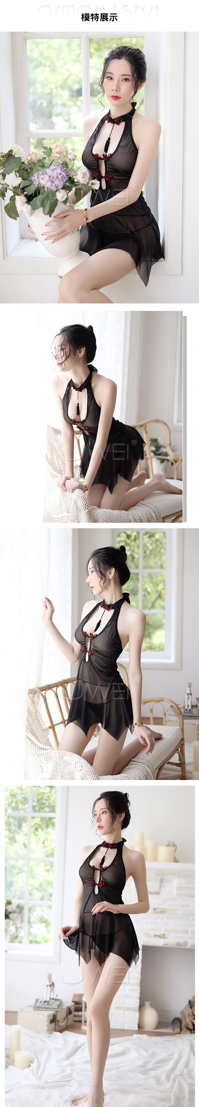 想入非非.深V鏤空復古透視掛脖繫帶旗袍服