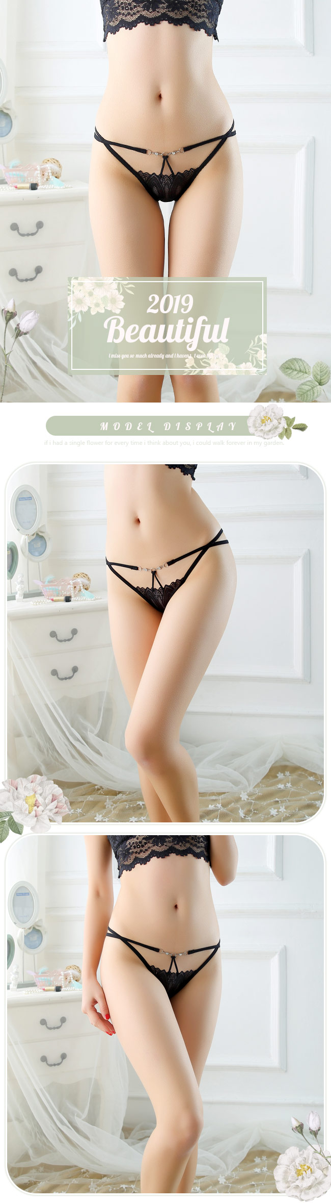 ◇◆時尚女伶.蕾絲繡花鏤空透視低腰丁字褲(黑)◆◇