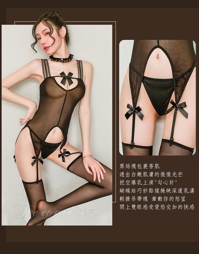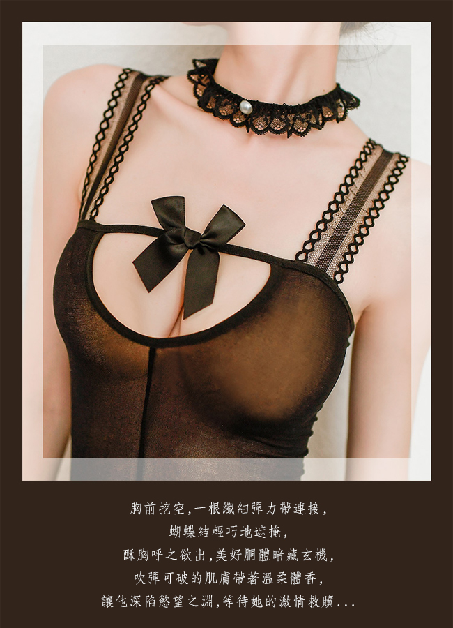 | 絲襪連身衣!滾邊肩帶珍珠蕾絲頸環蝴蝶結吊襪帶套裝