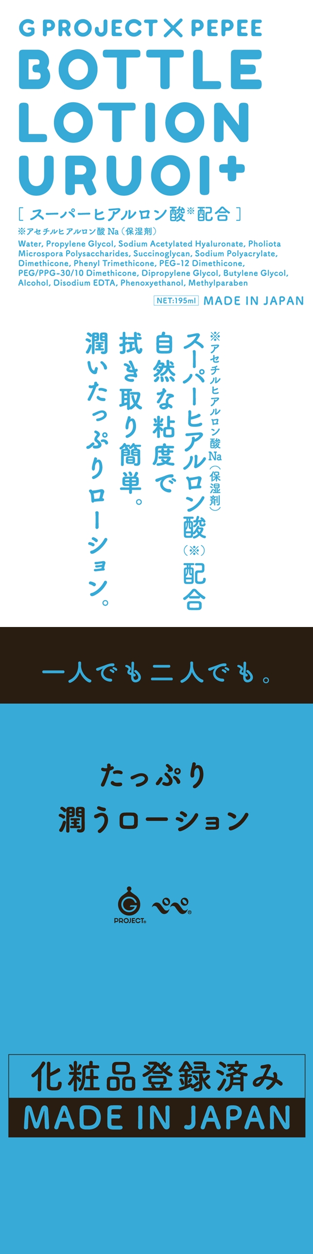 G PROJECT × PEPEE 推出玻尿酸潤滑油。可以高度保濕肌膚。沒有黏膩感,清爽的感覺好舒服。自然的黏度可以在使用後輕鬆擦拭乾淨一人也行兩人也好,多種情境都能使用。每個商品都是日本國內仔細的製造生產,故可放心直接塗抹在肌膚上使用。MADE IN JAPAN