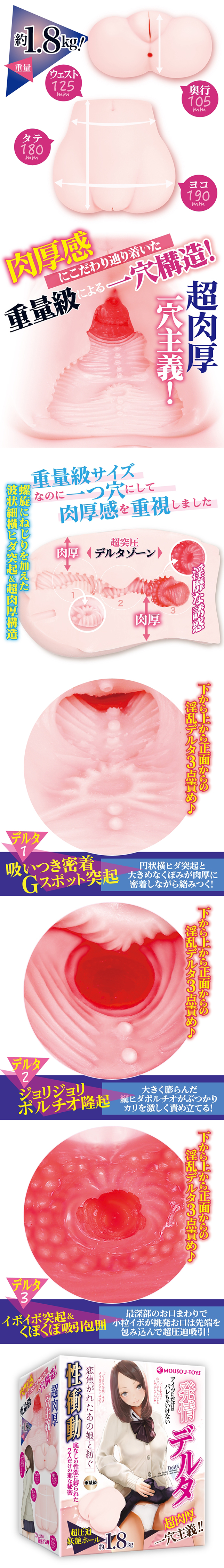 新品牌『MOUSOU-TOYS』的第二彈,1.8kg的重量級超壓迫妖艷自慰器!重量等級特別著重於肉厚感的單穴構造!扭轉螺旋加上波浪狀的薄平褶皺&超肉厚構造,淫穢而誘惑。由三角洲『吸吮緊密接觸G點內』『刺激的宮頸口隆起』『顆粒突起&吸著包圍』這三點從下到上再到正面進攻♪淹沒在壓到性的緊縮和緊密接觸感中,請在被慾望驅使的同時從前面從後面推進!屁屁上的孔是裝飾,所以您只要玩弄它。 插畫家:使用T乳液。附潤滑油。插畫家:T 審查編號:2003546