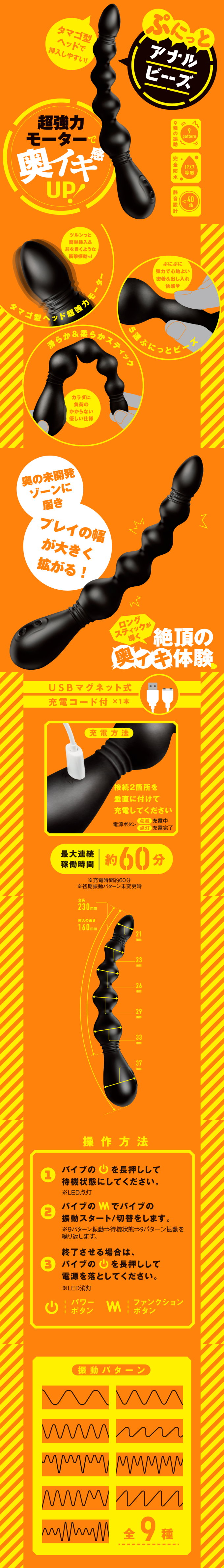 長棒棒帶您體驗絕頂深入高潮★PPP推出具有超強力馬達的完全防水拉珠!超強力馬達蛋形頭使其可以輕鬆插入&滲透心底的衝擊振動!光滑且柔軟的棒棒,溫柔的規格不會對身體造成負擔♪連續5顆富有彈性的珠子,舒適的緊密感&進出的快感!完全防水規格,使用後也無需擔心清潔的問題!不到40db的靜音設計,您可以盡情享受而不必擔心噪音!跳蛋:充電時間約60分鐘,最大連續使用時間約60分鐘(當初始振動模式不變時)_IPX7級_9種振動模式_靜音設計<40db_附屬品:USB磁吸式充電線審查編號:2005007