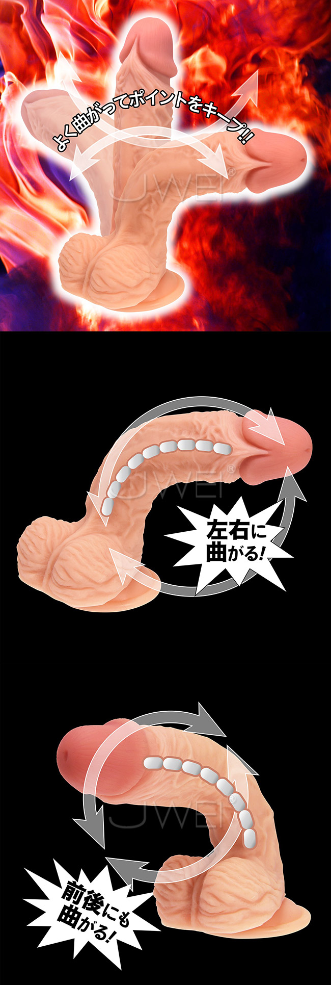 ディルド史上最高最強級のクオリティといっても過言ではないでしょう。 柔らかくも張りのある、超リアル肉感!!浮き上がる情熱のスジが映えるハイパーリアルな竿の絶妙な硬さと肉感は、目を見張ります。 本体の中心に特製「曲がる芯」を内蔵して折り曲げ自由自在なので、前後左右、お好みの角度調整ができます。 強力吸盤付きで様々なプレイが楽しめる最強ディルドの登場です。
