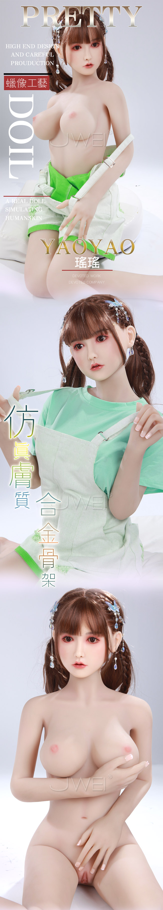 鄰家系女孩瑤瑤,全實體醫療級矽膠倒模,彈性極佳,按照真人黃金比例設計,內置不鏽鋼變形骨骼,可站立身軀,解鎖更多姿勢技巧。