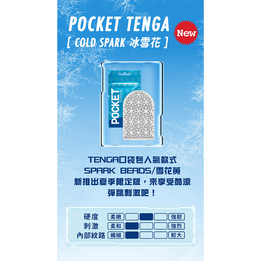 商品編號:POT-006C 商品名稱:POCKET TENGA 口袋包 [COLD SPARK/冰雪花] 主體尺寸 : 10×88×150mm(含外包裝)/6×55×75mm(僅主體) 主體重量 : 約24.5g(含外包裝)/約16g(僅主體)