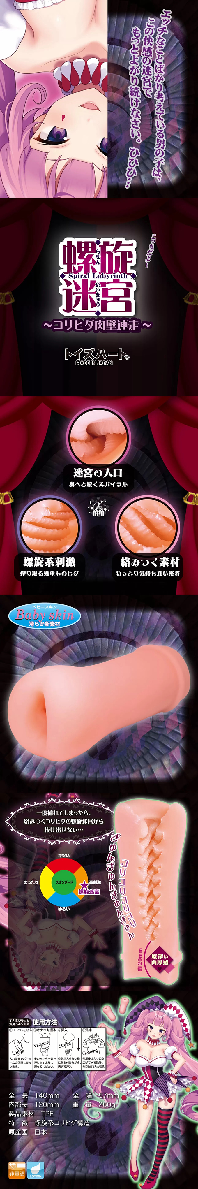 螺旋迷宮 ~コリヒダ肉壁連走~,以簡單的螺旋內紋,配合緊窄的通道,給你最直接的刺激快感!底部肉壁達2cm,使你在暴力玩樂時也不用擔心底部破裂的問題,大大加強了耐用性!產品整體只有255g 重,其細小的體積也能放進大部份充氣娃娃中使用,讓產品能給你多樣化的插入體驗!