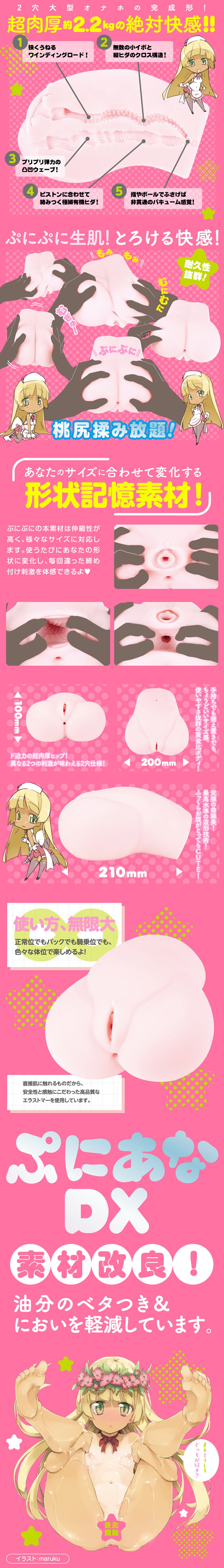 Q彈又可愛!最強自慰套『普妮安娜DX』的素材變得更好了。減少油分的黏答答感&減輕氣味。壓倒性的逼真使用感,滿足度MAX!重量厚實約為2.2kg!黃金比例身材,恰到好處的尺寸,無論是手持還是固定都方便使用!極致的曲線美是造型技術的最高境界!微凸的肚子超級可愛!超級有氣勢的超肉厚臀為能讓您享受兩種不同的刺激的雙穴規格!使用方法無限可能!無論是正常體位、後背式還是騎乘式,各種體位都能享受!由於會與肌膚直接接觸,因此特別注重安全性和觸感而使用了高品質的彈性體。超耐用的蜜桃臀,愛怎麼揉就怎麼揉!Q彈的皮膚,讓人融化的快感!長年備受好評,講究的內部結構依然存在於!採用會配合您的尺寸而變化的形狀記憶素材!QQ彈彈的本素材極有彈性,可配合各種尺寸。每次使用都會配合您的形狀,每次都能體驗不用的緊縮感!雙穴大型自慰套的完成體在此誕生!包裝插畫師:maruku 審查編號:2202546