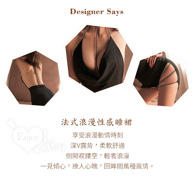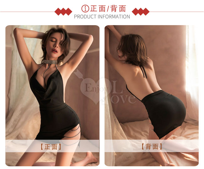 | 情趣睡衣!綁脖晶亮鍊條誘惑裸背側開衩鏤空連身裙兩件組