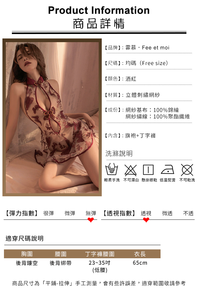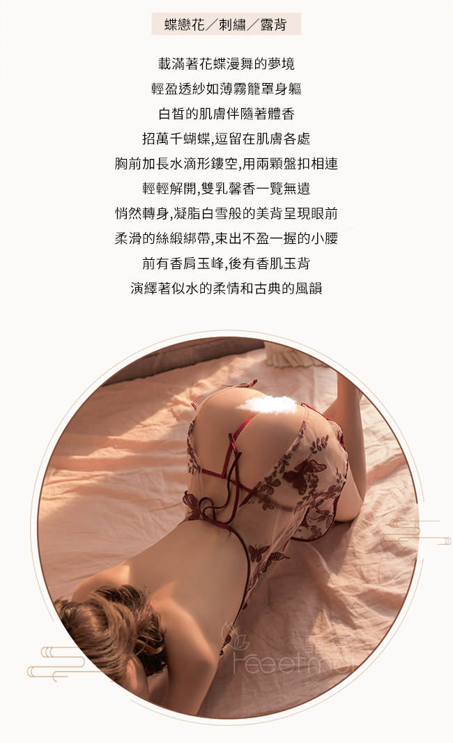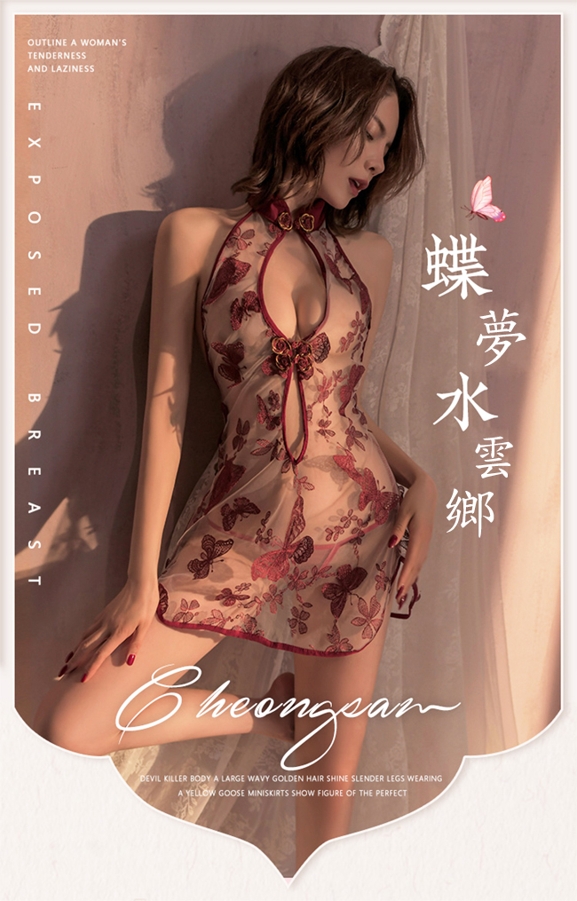 ►您現在的位置:首頁>仿旗袍睡衣!蝴蝶刺繡挖空美胸露臀綁帶透紗兩件組﹝酒紅﹞