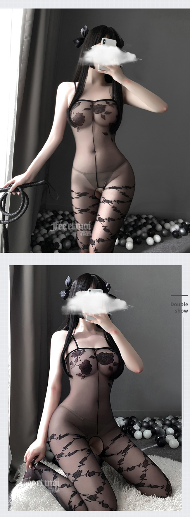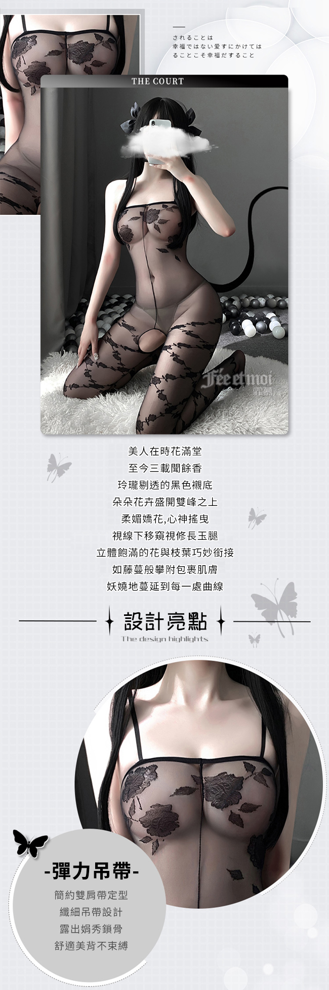 絲襪連身衣!彈力肩帶黑玫瑰刺繡花朵纏繞玉腿開檔裝