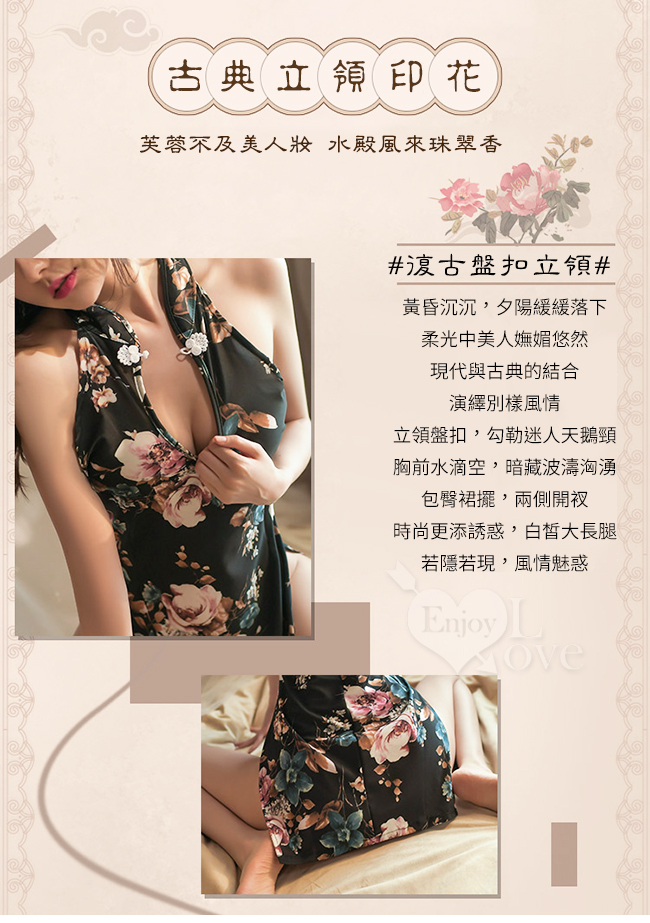 ►您現在的位置:首頁>仿旗袍睡衣!古典立領盤釦削肩露溝印花高開衩連身裙兩件組