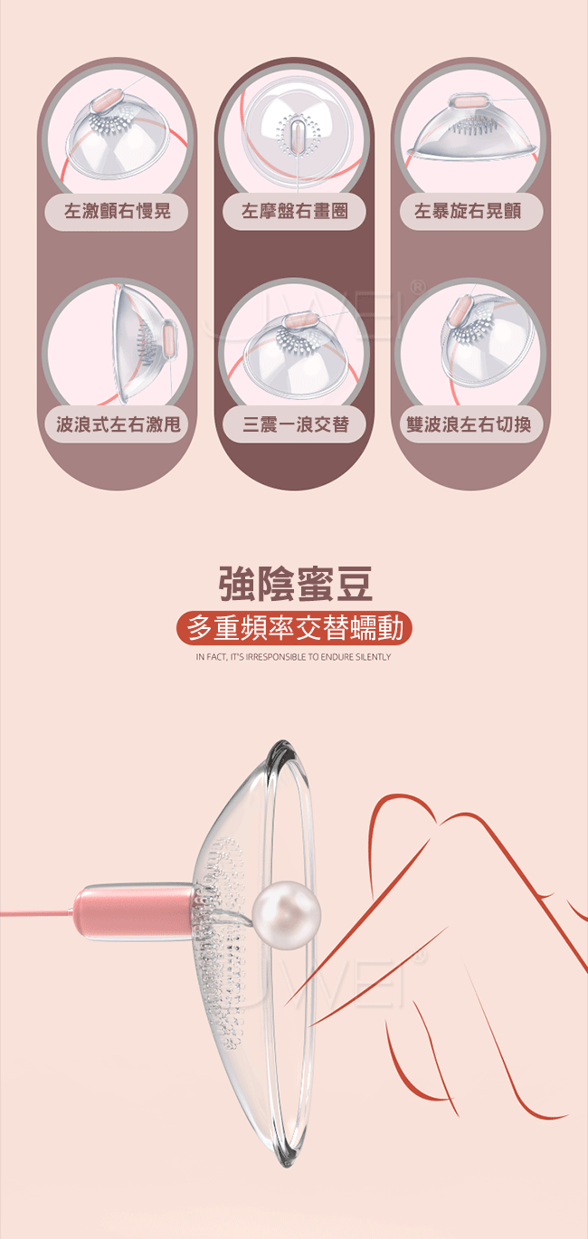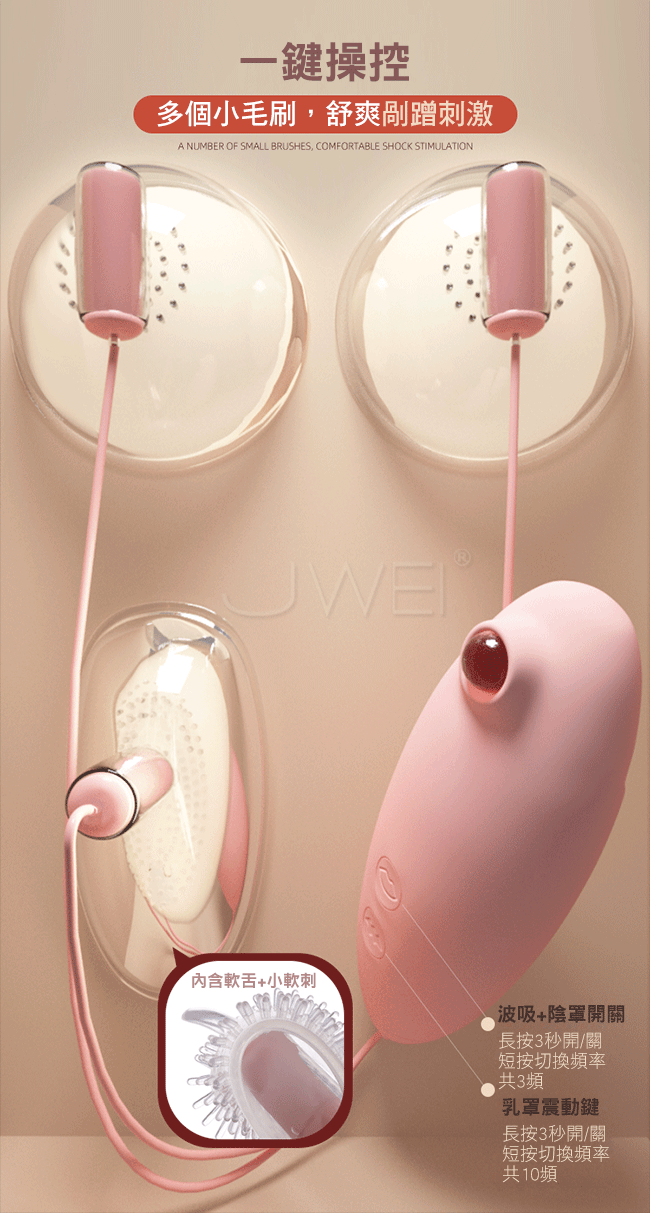 波吸+強震+按摩雙重刺激體驗,刺激雙峰酥麻震激起水波蕩漾多角度包裹雙峰!吸盤蠕吸輕陰部薄貼合吸附強,Q彈小舌頭,狂舔蜜豆~10重頻率,滿足您不同需求~三點操控衝擊雙峰沸點值讓您高潮不斷來襲。