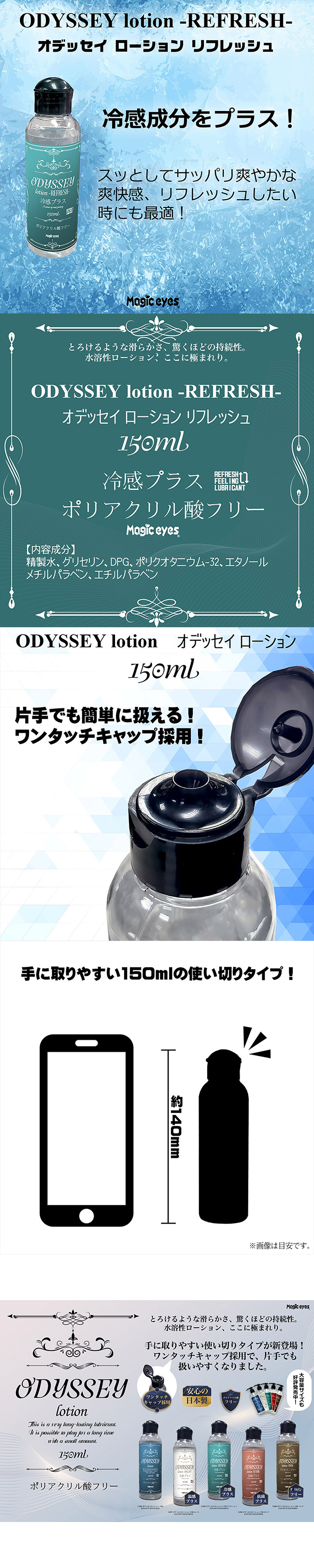 ポリアクリル酸フリーの水溶性ローションでありながらオイルローションのような滑らかな使用感。糸を引くようなタイプのローションでは無いので馴染ませながら少しずつ量を増やしていって下さいREFRESHは冷感タイプなので暑い時はもちろん使用後の清涼感を求める方には最適です。ボトルにはワンタッチキャップを採用しておりますので取り回しも簡単です。日本製