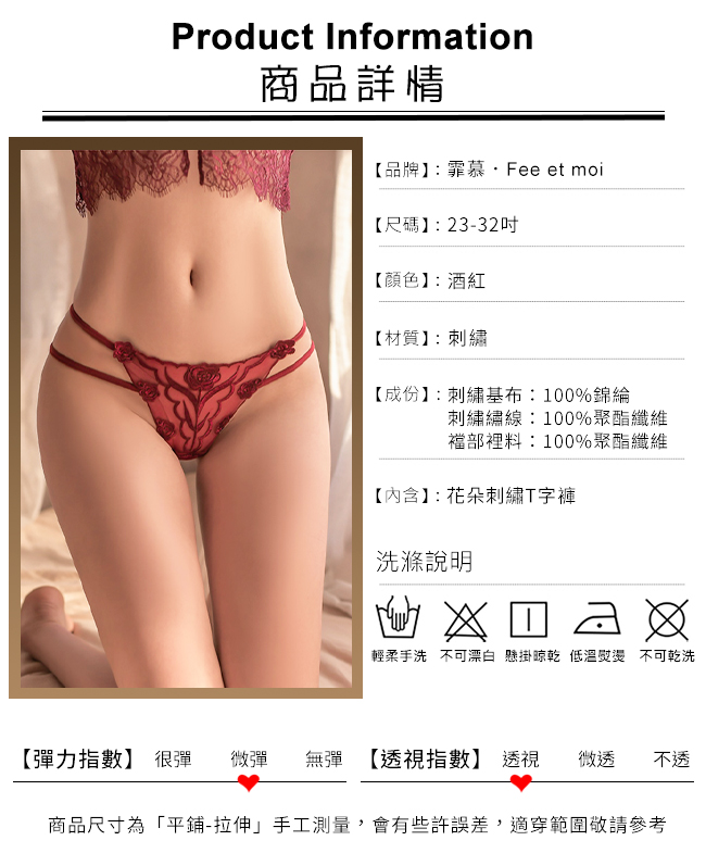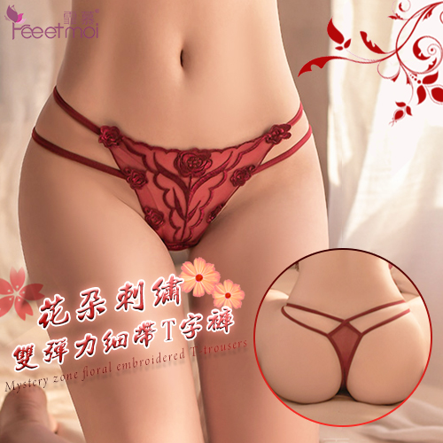 | 神秘地帶花朵刺繡雙彈力細帶T字褲﹝酒紅﹞