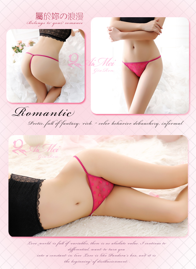 薄透網紗加上圓點可愛設計~ 猶如甜蜜樂章,令人陶醉的詩情畫意… ※ 內褲款式:丁字褲。 ※ 設計特色:圓點網紗。 ※ 商品材質:網紗。 ※ 功 能:性感、美體。 ※ 腰 型:低腰。 ※ 顏 色:玫紅色。 ※ 商品尺碼:FREE SIZE (適合腰圍23~29吋)。 ※ 長度單位換算 : 1吋=2.54cm。 ※ 注意事項:基於保障消費者個人衛生,此貼身衣物恕不接受退換貨,謝謝您! (如為商品本身暇疵,接受七日內換貨,請勿試穿,謝謝您)