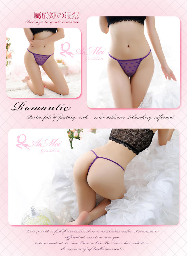 薄透網紗加上圓點可愛設計~ 猶如甜蜜樂章,令人陶醉的詩情畫意… ※ 內褲款式:丁字褲。 ※ 設計特色:圓點網紗。 ※ 商品材質:網紗。 ※ 功 能:性感、美體。 ※ 腰 型:低腰。 ※ 顏 色:紫色。 ※ 商品尺碼:FREE SIZE (適合腰圍23~29吋)。 ※ 長度單位換算 : 1吋=2.54cm。 ※ 注意事項:基於保障消費者個人衛生,此貼身衣物恕不接受退換貨,謝謝您! (如為商品本身暇疵,接受七日內換貨,請勿試穿,謝謝您)