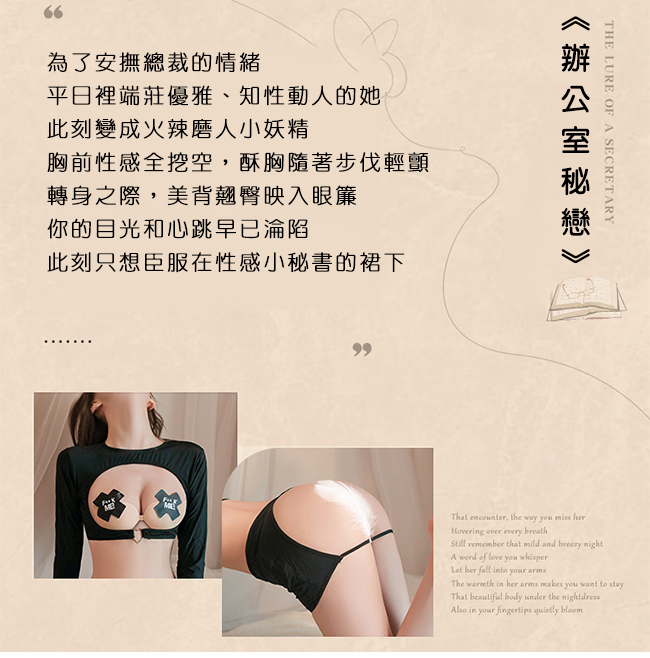 ►您現在的位置:首頁>秘書角色扮演服!大膽挖空爆乳裸臀短裙含乳貼四件式套裝