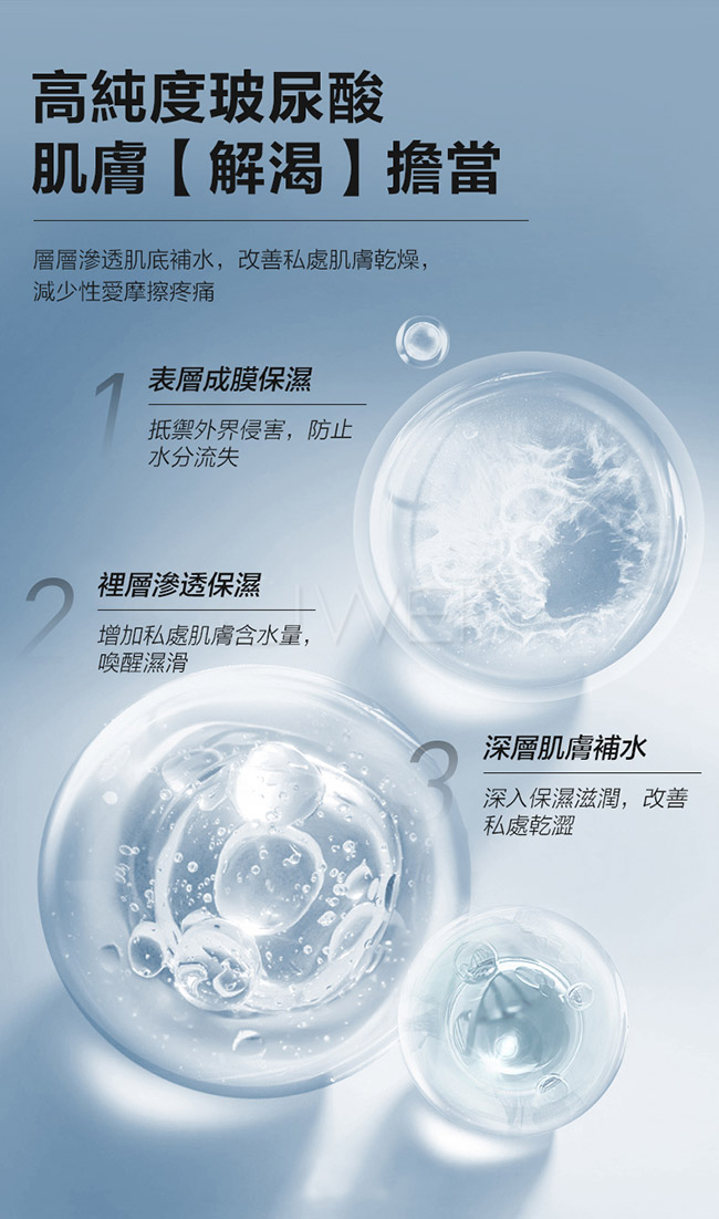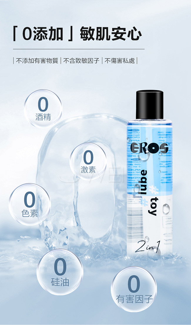 雙效保濕,強效持久,有效擊退性愛乾澀;雙重補水因子,私處嘭嘭水潤,高補水因子,瞬間巨神水,從根源上解决,乾澀問題,享受爽滑快感;高濃度潤滑更持久,低敏高濃度配方,持久的潤滑度,愛愛中途無需“加油”EROS專研配方,安全地適用於所有類型的性玩具;清爽易洗,水溶性配方,質地清爽!